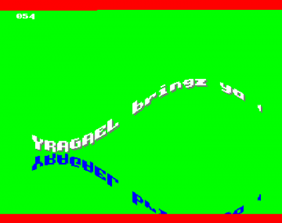 En bonus, ce source contient un code qui détermine le nombre de lignes parcourues par le faisceau d'électrons entre le début et la fin des calculs d'une trame. Ce code affiche ce nombre en décimal en haut à gauche - en PAL, c'est-à-dire à 50Hz, le faisceau d'électrons parcourt 313 lignes. Pour visualiser ce temps pris par les calculs, la couleur 0 est passée en rouge au début de cette période et en vert à sa fin.